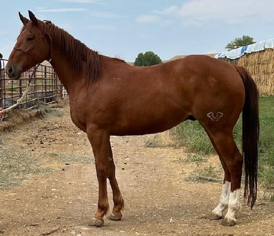 Eyesa Special Decker Sorrel Gelding with a few white hairs and socks on hind. DOB: April 25, 2021 AQHA # 6121255